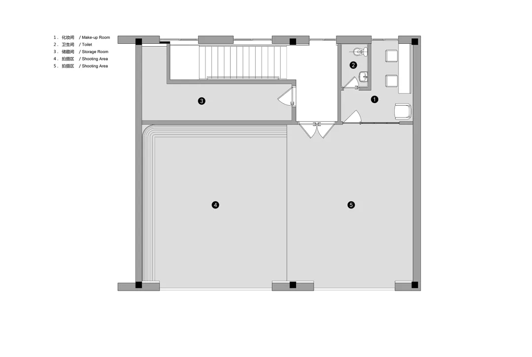 ASTUDIO攝影工作室是一個多功能的復合空間,UUA把拍攝、化妝、接待、辦公、會議、休閑等多種功能有機地融合在這個通高的廠房之中,空間緊湊又富于變化。拍攝區(qū)為最重要的功能單元,由于需要足夠的長寬高空間來滿足設置無影墻、布景布光以及拍攝距離等需求,所以設計師將一層的一半劃歸為1號拍攝區(qū),保留雙層通高的空間形式;另一半則加建出雙層空間,其中一層作為接待,二層作為辦公。廠房的三層因為原本具有足夠的層高,因此被設置為2號拍攝區(qū)。