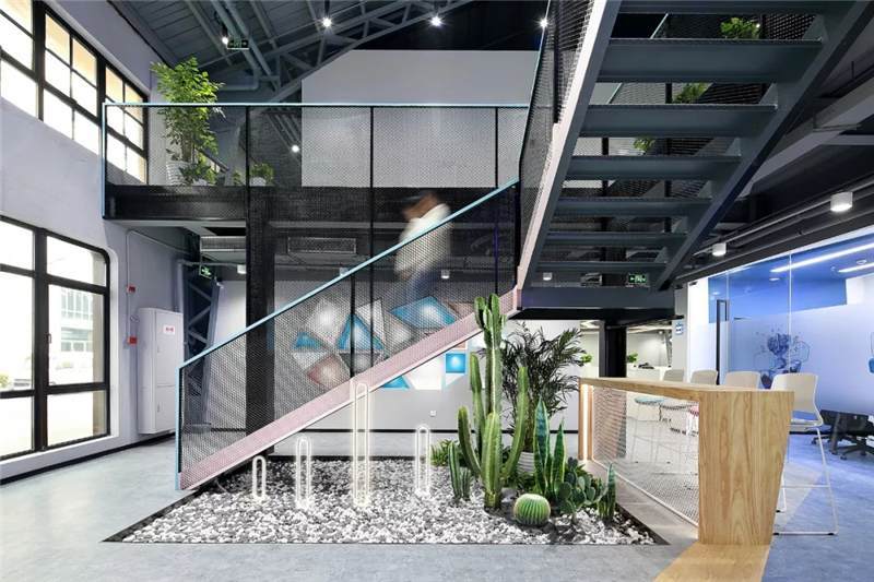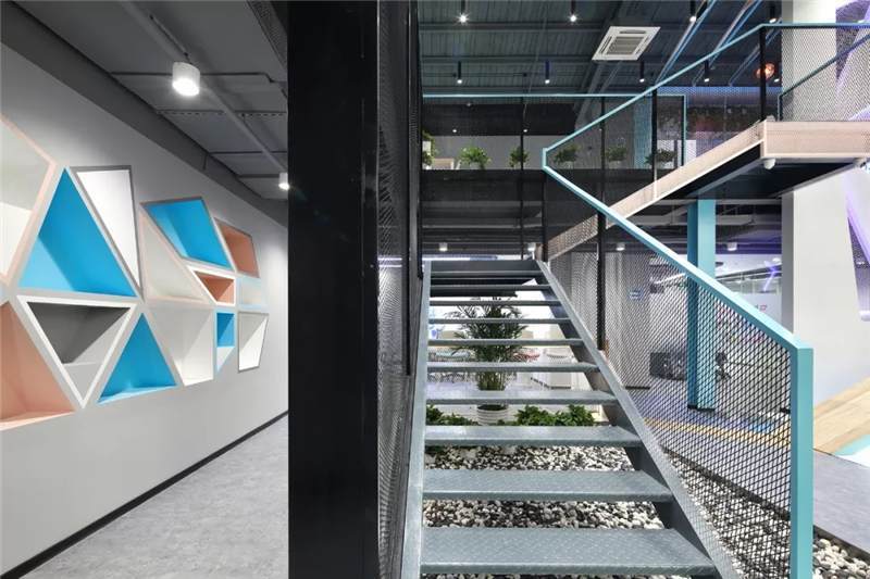 前廳左側,設計結構簡單的樓梯,運用與二層欄桿材質相同的鐵絲網(wǎng)扶手,使得兩層樓形成一個工業(yè)風的整體。側邊與扶手點綴以藍色和粉色的噴漆,樓梯下布置用鵝卵石,仙人掌和燈光組成的景觀裝置小品,讓整個電競空間生機勃勃,平添許多年輕活躍的氛圍。此處木飾面的吧臺延伸到地面再與前臺、右側大臺階連接形成一個整體,使整個空間更加連貫統(tǒng)一。