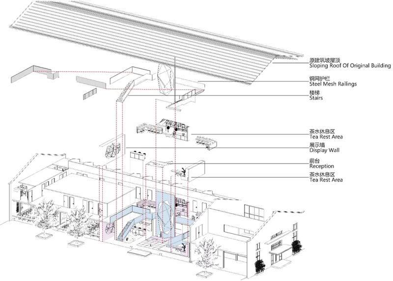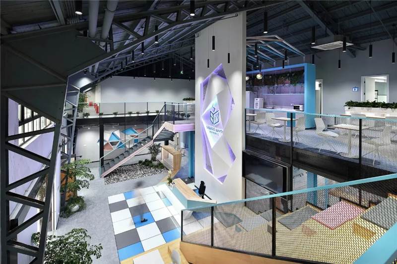 本案位于上海市寶山區(qū)蘊川路6號智慧灣科創(chuàng)園,原建筑為3D打印的廠房裝修,室內(nèi)最高凈高9米,最低6.4米。此空間除原建筑結構墻外,無任何結構柱與墻體,因此為了更充分合理的利用空間,設計師構筑了二層,根據(jù)嗶哩嗶哩電競的辦公功能訴求,布置空間功能區(qū),即1F分布前臺區(qū)、會議區(qū)、茶水接待區(qū)、賽訓室、開敞辦公區(qū)、導播室。2F分布就餐區(qū)、住宿區(qū)、導播室等空間。