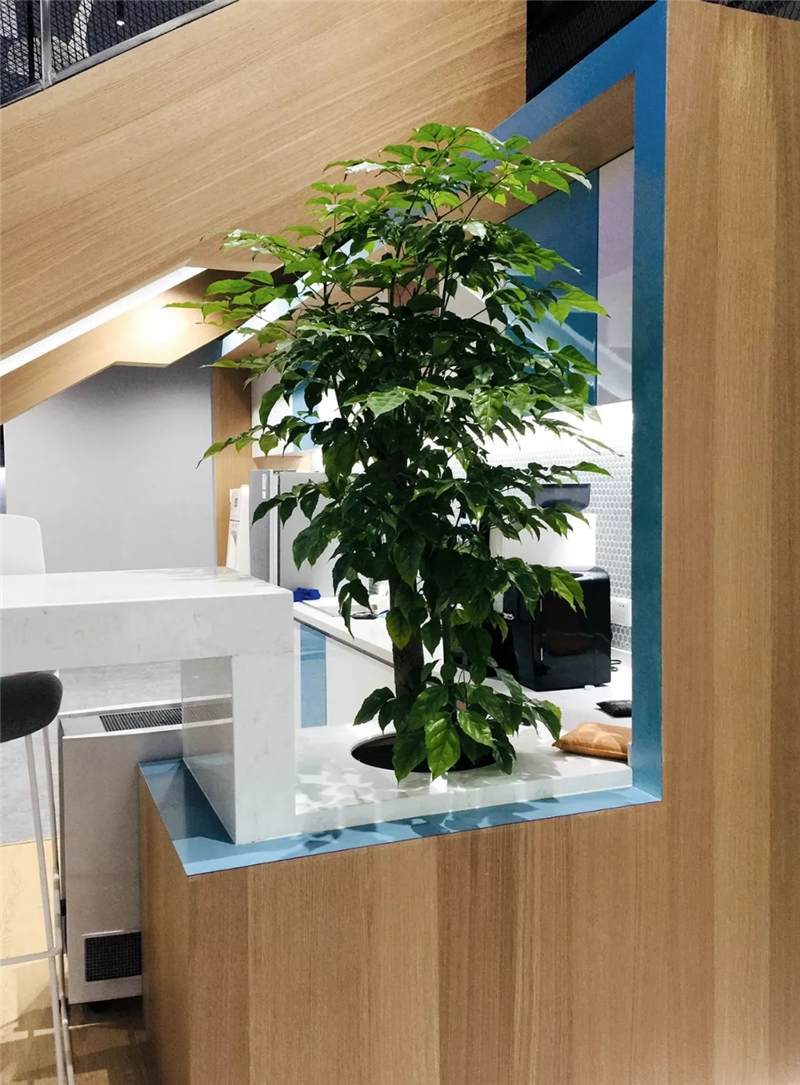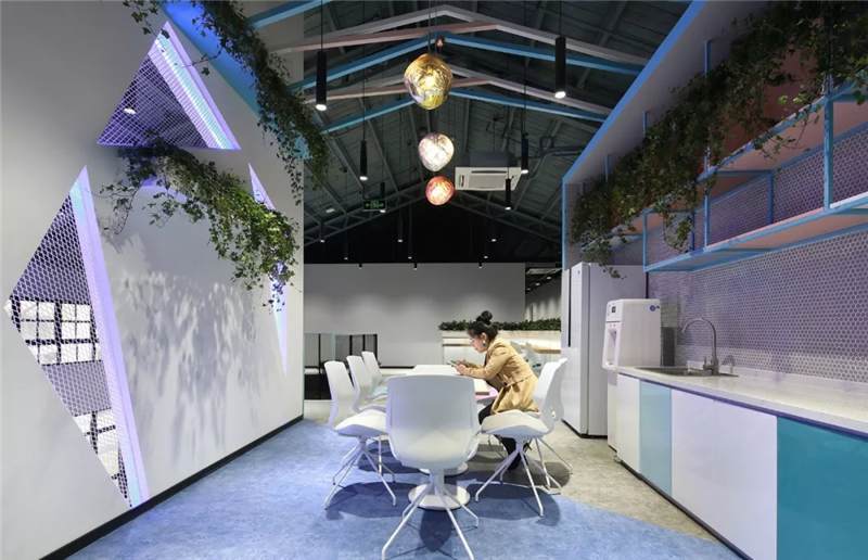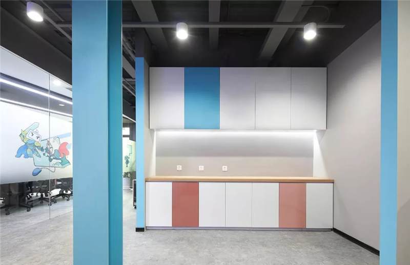 吊柜打破了傳統(tǒng)的平開門形式,使用開放的彩色盒子,實用兼裝飾功能。另外設計師還根據(jù)層高差,在茶水區(qū)頂部設計三角形格柵,茶水柜上方及背景墻后方,點綴綠植,使整個空間富有生態(tài)氣息,在光影的效果呈現(xiàn)別樣風采。