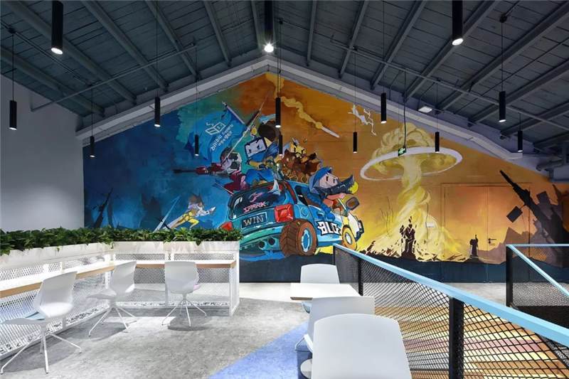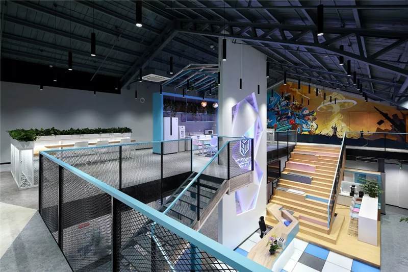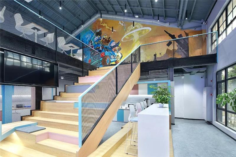 二層大臺階入口處設計師設置醒目的電競主題手繪圖,巧妙的把原本的雙開門變成隱形門,墻內(nèi)部為電競導播室。手繪圖豐富的色彩,突出的電競主題,卡通的形象,把BILIBILI的風格呈現(xiàn)的淋漓盡致。