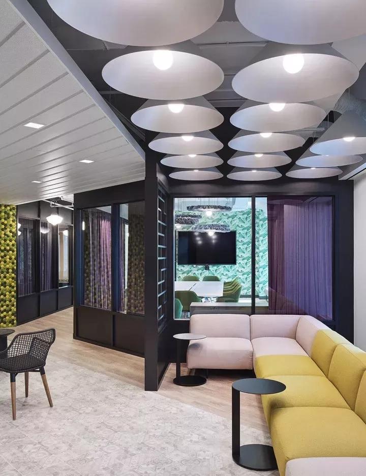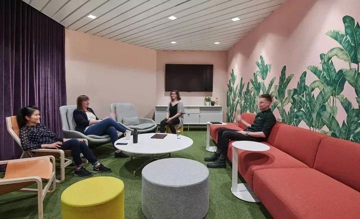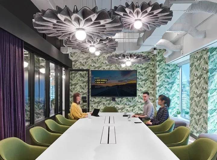 一間正式會(huì)議室,墻面鋪滿(mǎn)了綠色棕櫚葉墻紙,并配以綠色扶手軟椅,在綠色清新風(fēng)中,具有吸音性能的紫色布藝窗簾形成鮮明的色彩對(duì)比。毛氈聲學(xué)燈具BuzziPleat更是為整個(gè)空間錦上添花,帶來(lái)美美的視覺(jué)。