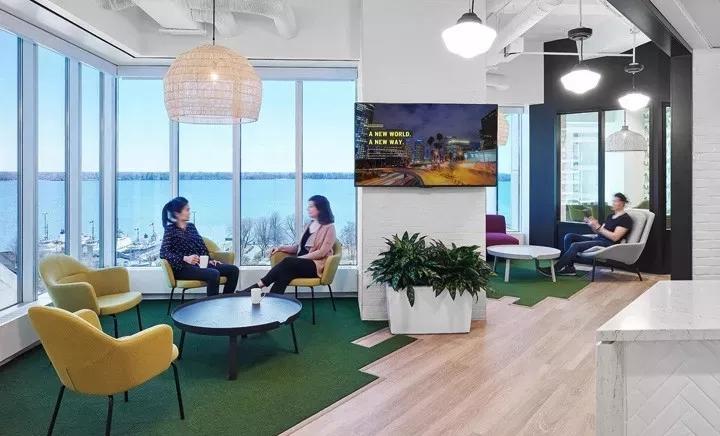 如“起居室”般的非正式會(huì)議室,則裝飾以居家般的家具營(yíng)造舒適的氛圍,透過(guò)開(kāi)敞的落地窗,煙波浩淼的安大略湖的美景盡收眼底,縱目四望,曠達(dá)不羈。綠色草皮般的地毯在這里隨處可見(jiàn)。