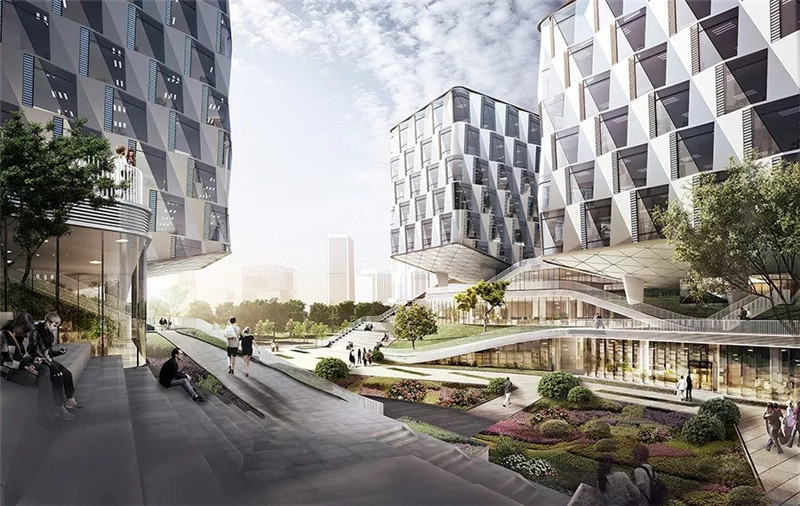 塔樓的形態(tài)力求簡潔,形成三個(gè)體塊與裙房的對比關(guān)系,具有一定的標(biāo)識(shí)性。而在平面上稍作轉(zhuǎn)折變化,從視覺上消減建筑體量的壓迫感。每一幢塔樓都以左高右低的態(tài)勢首尾呼應(yīng),增強(qiáng)了建筑單體之間聯(lián)系,豐富了建筑天際線的變化。塔樓底部在裙房之上的局部起翹又為空間增加了多重的景深,在提供了多樣化的戶外活動(dòng)與景觀空間的同時(shí),也在視覺效果上營造了一種即將破浪躍起的動(dòng)感,呈現(xiàn)活躍而又靈動(dòng)的生命力。