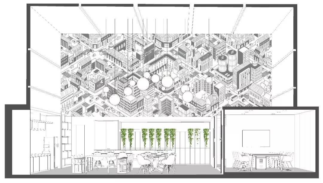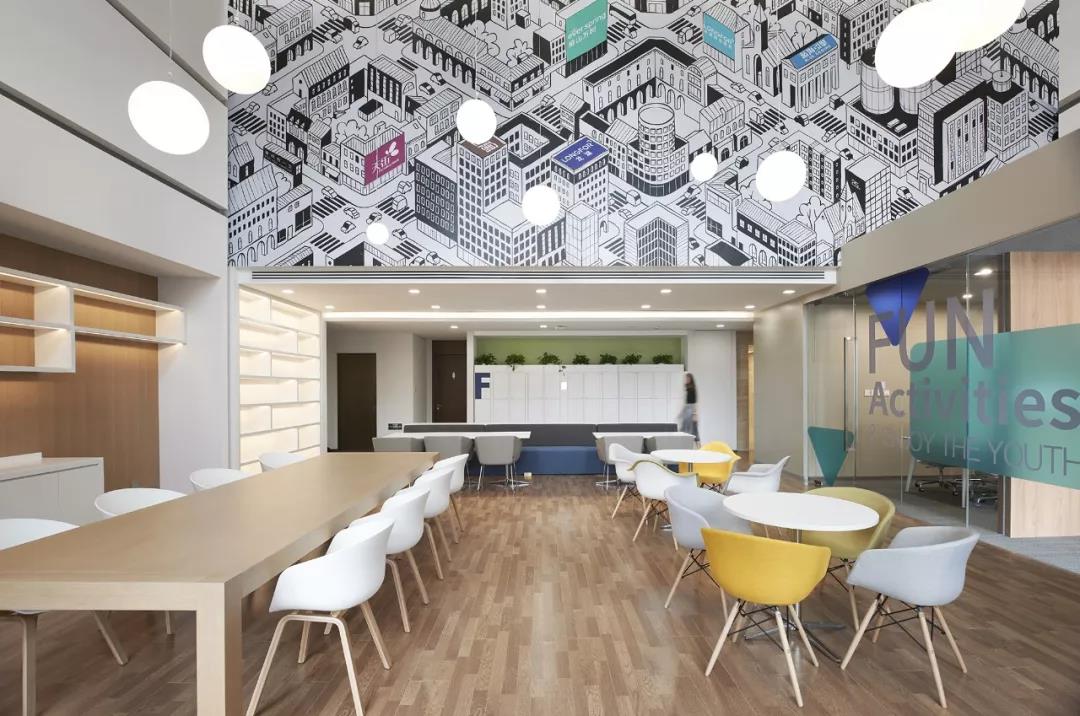 南側(cè)挑高區(qū)的空間定義為“城市客廳”,視覺感受區(qū)別于北區(qū)的咖啡主題,更加明快現(xiàn)代,為整個(gè)辦公區(qū)帶來時(shí)尚、活躍、靈動(dòng)的感受。“活力城市”的軸側(cè)插畫裝點(diǎn)了整個(gè)挑高區(qū)二層墻面,龍湖重點(diǎn)產(chǎn)品的標(biāo)識(shí)隱含其中,傳達(dá)出龍湖精彩紛呈的產(chǎn)品類型和高品質(zhì)特征。