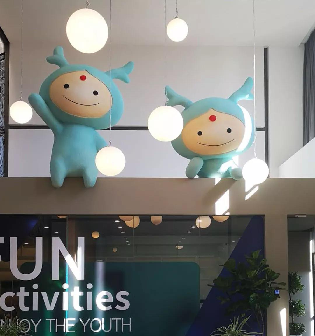 此區(qū)域另外的一個(gè)亮點(diǎn)是在會(huì)議室頂端利用空間設(shè)置了“龍小湖”巨型卡通造型,同此空間的人招手互動(dòng),為空間帶來了一種親和的童趣。也是傳達(dá)龍湖企業(yè)形象的一處絕佳空間。
