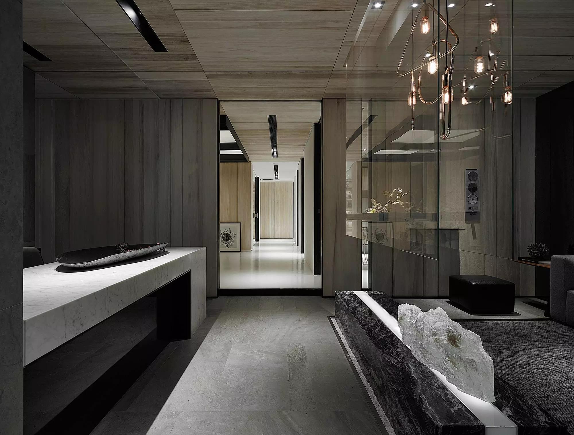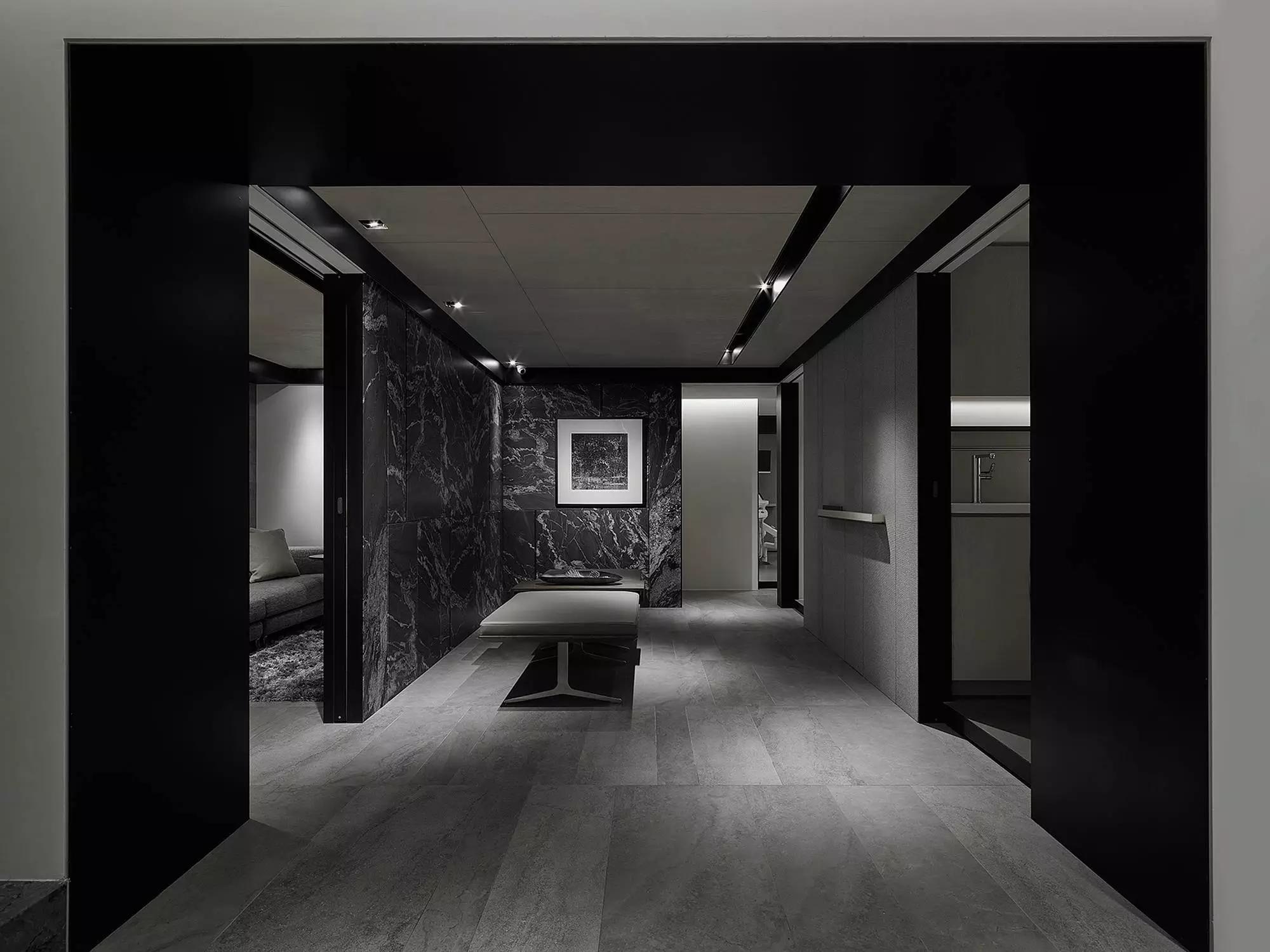 將玄關刻意退縮于室內、入口大門轉向,而產(chǎn)生一進一景之空間體驗層次,寬闊的騎樓面積與門口的虛空間,未踏入空間卻已感受沈穩(wěn)安定。